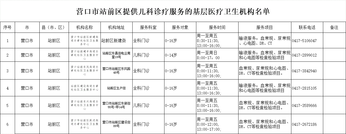 营口市站前区提供儿科诊疗服务的基层医疗卫生机构名单