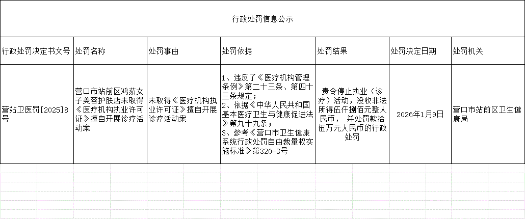 营口市站前区鸿茹女子美容护肤店未取得《医疗机构执业许可证》擅自开展诊疗活动案