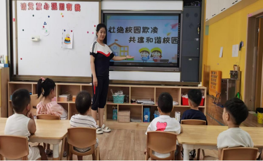 各班教师根据班级幼儿年龄特点,结合校园欺凌和暴力事件案例,利用观看防欺凌视频、儿歌、游戏等教育方式,对幼儿进行防欺凌安全教育,让幼儿了解幼儿园欺凌及暴力行为的危害性,学会保护自己,勇敢地对欺凌行为说“不”,学会关爱身边的人,成为有礼貌、能谦让、讲文明的好孩子。