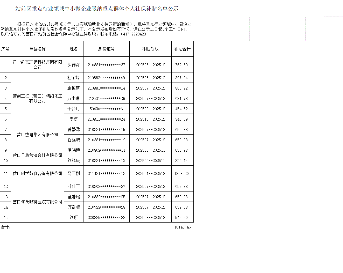 站前区重点行业领域中小微企业吸纳重点群体个人社保补贴名单公示